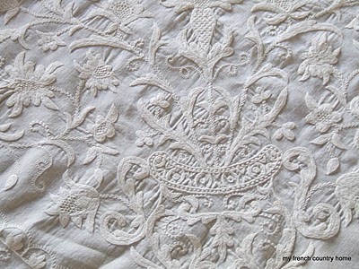 This 18th century tablecloth is an absolutely stunning piece that I found at the beautiful site of http://www.myfrenchcountryhome.blogspot.com/ The exquisite detail of this piece is breathtaking and I just had to do a post on it which Sharon kindly allowed me to do. This piece is circa 18th century and is in mint condition with the exception of two small holes that could easily be repaired.
