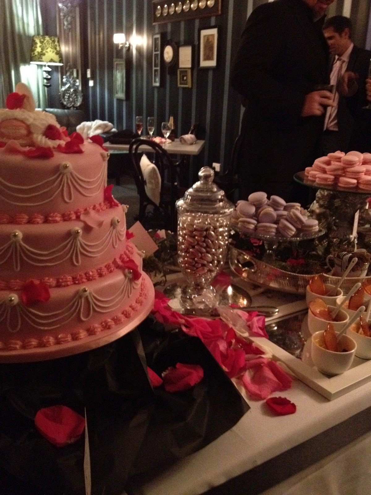 we feasted on an array of elegant cuisine including salmon mousse in pastry cornets, tiny petite venison burgers with caramelized onion relish, risotto in martini glasses, chicken liver pate, cheeses flown in from France, creme brulee, raspberry chocolate cups and my eternal favourite ...... Macarons in a mouth watering selection including one made especially for me ...... lavender!